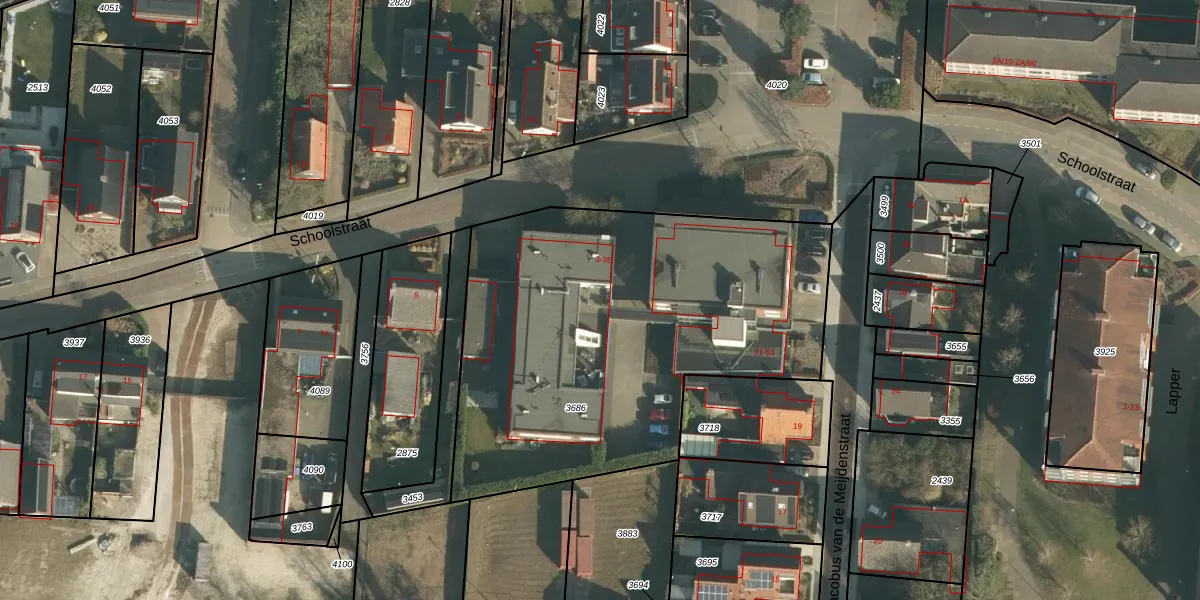 Het perceel waarop Schoolstraat 3 staat heeft een oppervlakte van 2270 m². Dit is een zeer groot perceel. De perceeloppervlakte wordt geregistreerd door het Kadaster. Gedetailleerde informatie over de maten van dit perceel kunt u vinden in het rapport Kadastrale kaart met maatvoering van Schoolstraat 3.