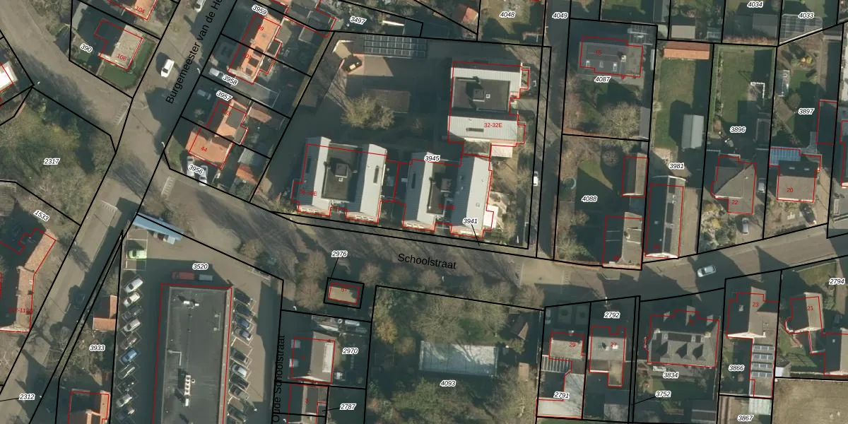 Schoolstraat 34 is gelegen op kadastraal perceel DNN00A3945. Deze kadastrale aanduiding is uniek en wordt gebruikt door het Kadaster om eigendomsrechten en andere zakelijke rechten vast te leggen. Het perceel maakt onderdeel uit van de kadastrale gemeente Drunen.