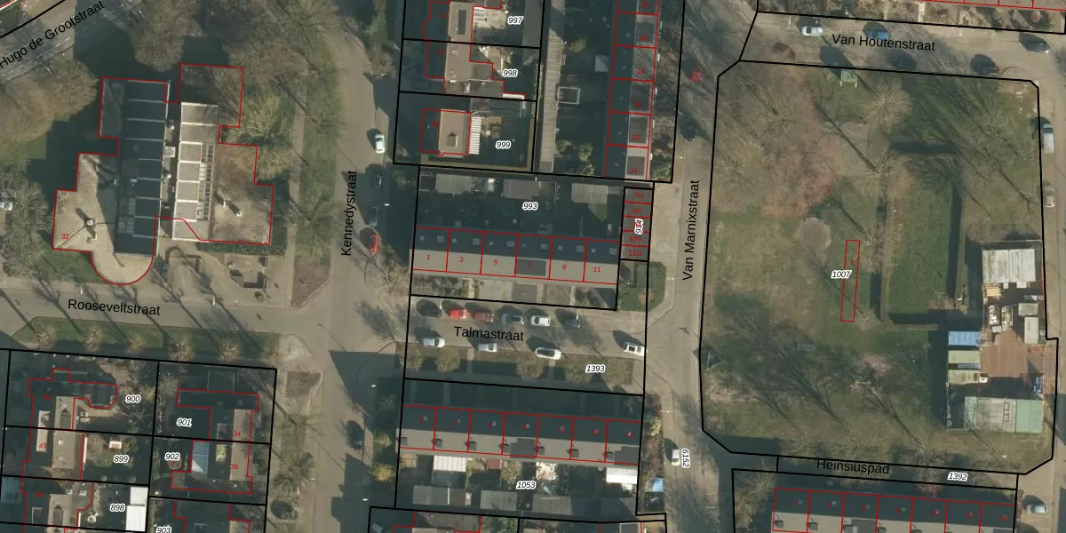 Het perceel waarop Talmastraat 7 staat heeft een oppervlakte van 962 m². Dit is een groot perceel. De perceeloppervlakte wordt geregistreerd door het Kadaster. Gedetailleerde informatie over de maten van dit perceel kunt u vinden in het rapport Kadastrale kaart met maatvoering van Talmastraat 7.