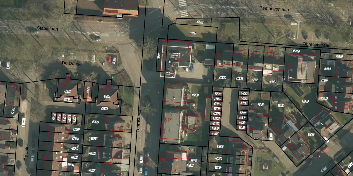 Het perceel waarop Torenstraat 94-B staat heeft een oppervlakte van 1645 m². Dit is een zeer groot perceel. De perceeloppervlakte wordt geregistreerd door het Kadaster. Gedetailleerde informatie over de maten van dit perceel kunt u vinden in het rapport Kadastrale kaart met maatvoering van Torenstraat 94-B.
