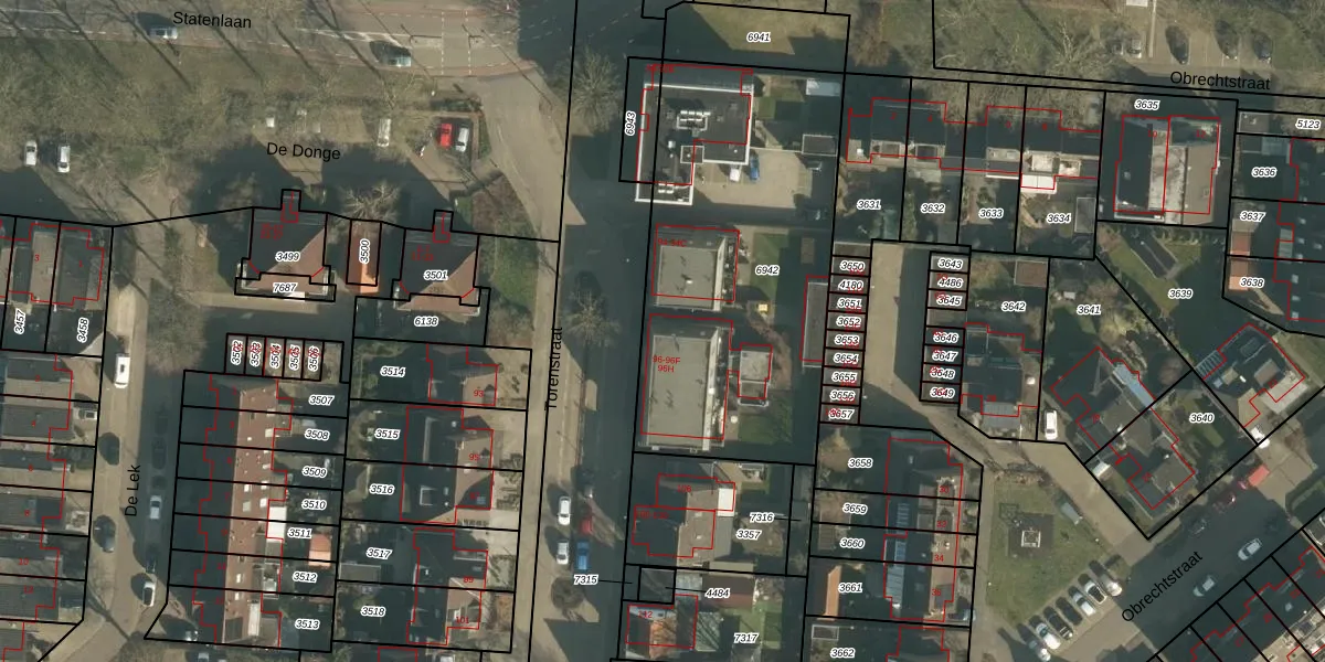 Het perceel waarop Torenstraat 96 staat heeft een oppervlakte van 1645 m². Dit is een zeer groot perceel. De perceeloppervlakte wordt geregistreerd door het Kadaster. Gedetailleerde informatie over de maten van dit perceel kunt u vinden in het rapport Kadastrale kaart met maatvoering van Torenstraat 96.