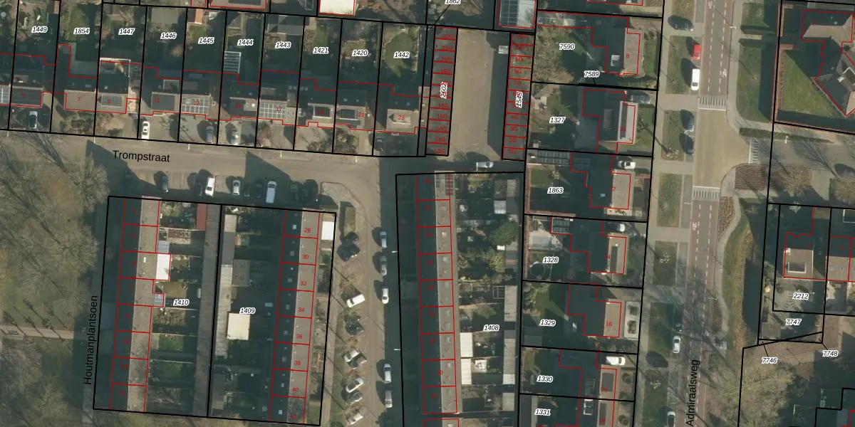 Het perceel waarop Trompstraat 27 staat heeft een oppervlakte van 2944 m². Dit is een zeer groot perceel. De perceeloppervlakte wordt geregistreerd door het Kadaster. Gedetailleerde informatie over de maten van dit perceel kunt u vinden in het rapport Kadastrale kaart met maatvoering van Trompstraat 27.
