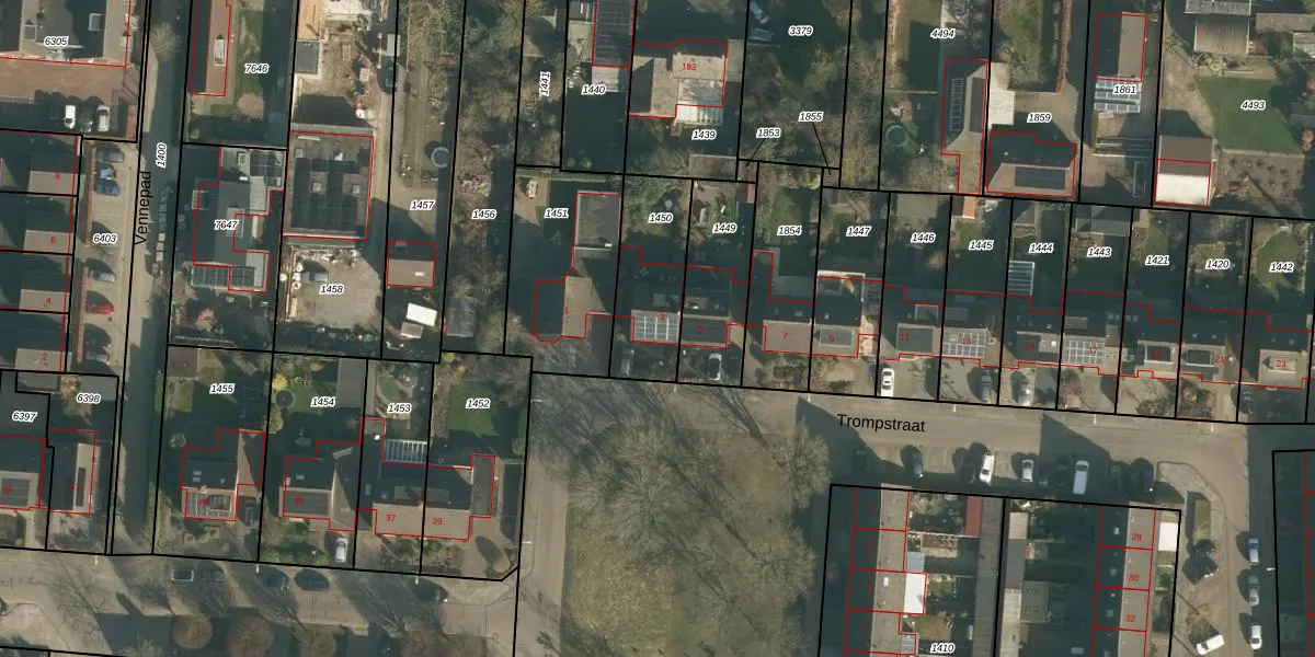 Het perceel waarop Trompstraat 3 staat heeft een oppervlakte van 320 m². Dit is een groot perceel. De perceeloppervlakte wordt geregistreerd door het Kadaster. Gedetailleerde informatie over de maten van dit perceel kunt u vinden in het rapport Kadastrale kaart met maatvoering van Trompstraat 3.