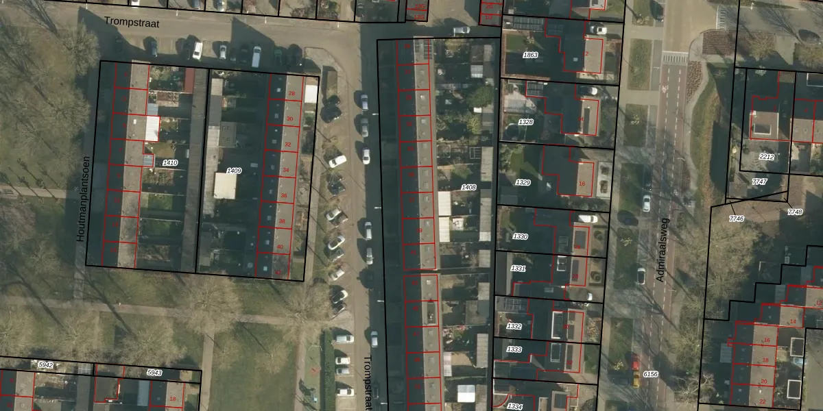 Het perceel waarop Trompstraat 37 staat heeft een oppervlakte van 2944 m². Dit is een zeer groot perceel. De perceeloppervlakte wordt geregistreerd door het Kadaster. Gedetailleerde informatie over de maten van dit perceel kunt u vinden in het rapport Kadastrale kaart met maatvoering van Trompstraat 37.
