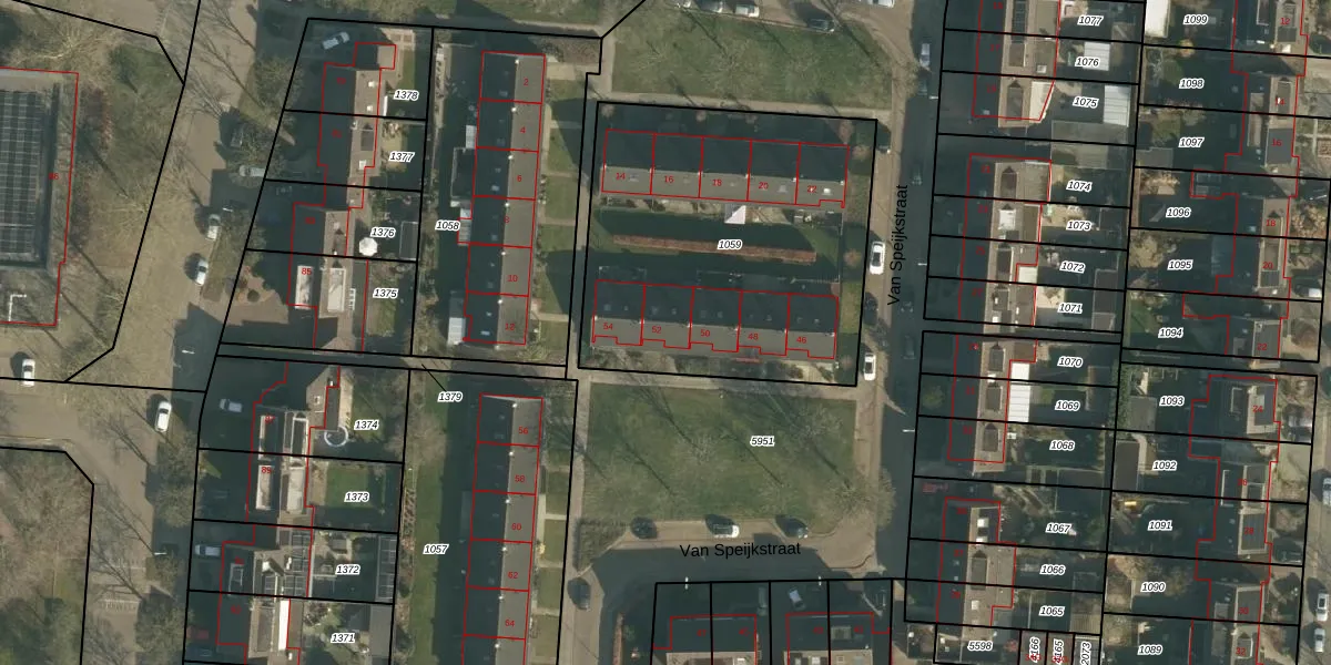 Het perceel waarop Van Speijkstraat 52 staat heeft een oppervlakte van 1674 m². Dit is een zeer groot perceel. De perceeloppervlakte wordt geregistreerd door het Kadaster. Gedetailleerde informatie over de maten van dit perceel kunt u vinden in het rapport Kadastrale kaart met maatvoering van Van Speijkstraat 52.
