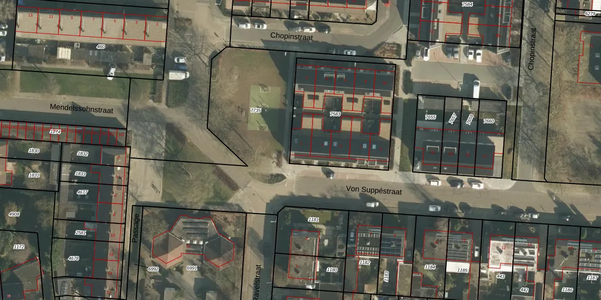 Von Suppéstraat 1 is gelegen op kadastraal perceel DNN00L7583. Deze kadastrale aanduiding is uniek en wordt gebruikt door het Kadaster om eigendomsrechten en andere zakelijke rechten vast te leggen. Het perceel maakt onderdeel uit van de kadastrale gemeente Drunen.