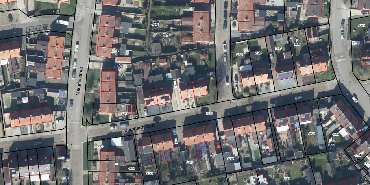Bernhardstraat 19 is gelegen op kadastraal perceel DTN03B4355. Deze kadastrale aanduiding is uniek en wordt gebruikt door het Kadaster om eigendomsrechten en andere zakelijke rechten vast te leggen. Het perceel maakt onderdeel uit van de kadastrale gemeente Druten.