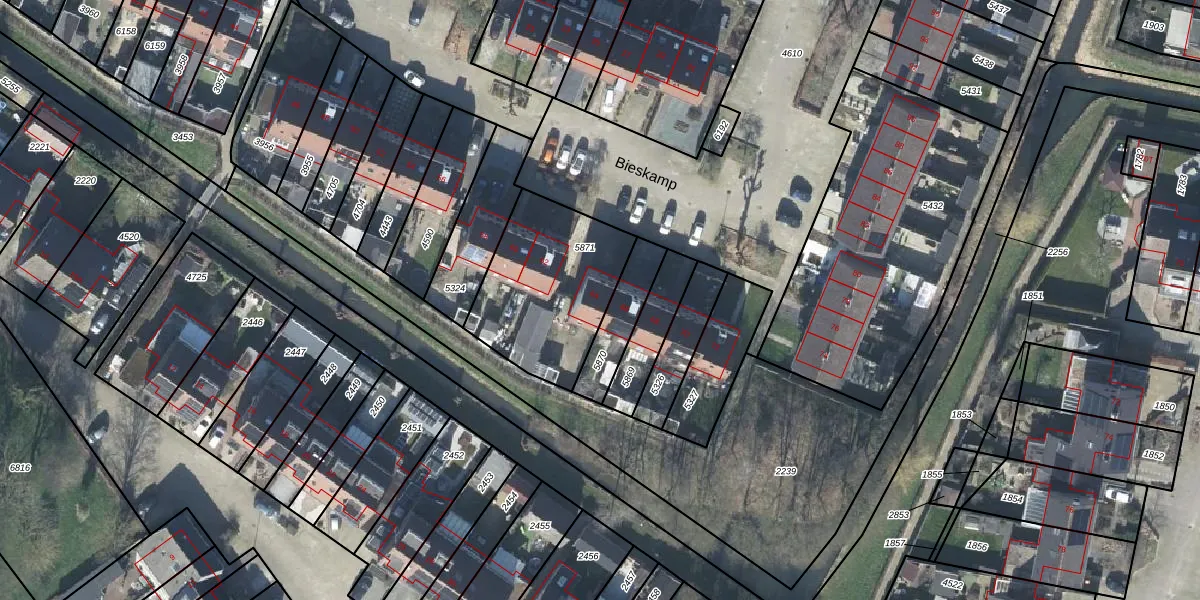 Het perceel waarop Bieskamp 64 staat heeft een oppervlakte van 578 m². Dit is een groot perceel. De perceeloppervlakte wordt geregistreerd door het Kadaster. Gedetailleerde informatie over de maten van dit perceel kunt u vinden in het rapport Kadastrale kaart met maatvoering van Bieskamp 64.