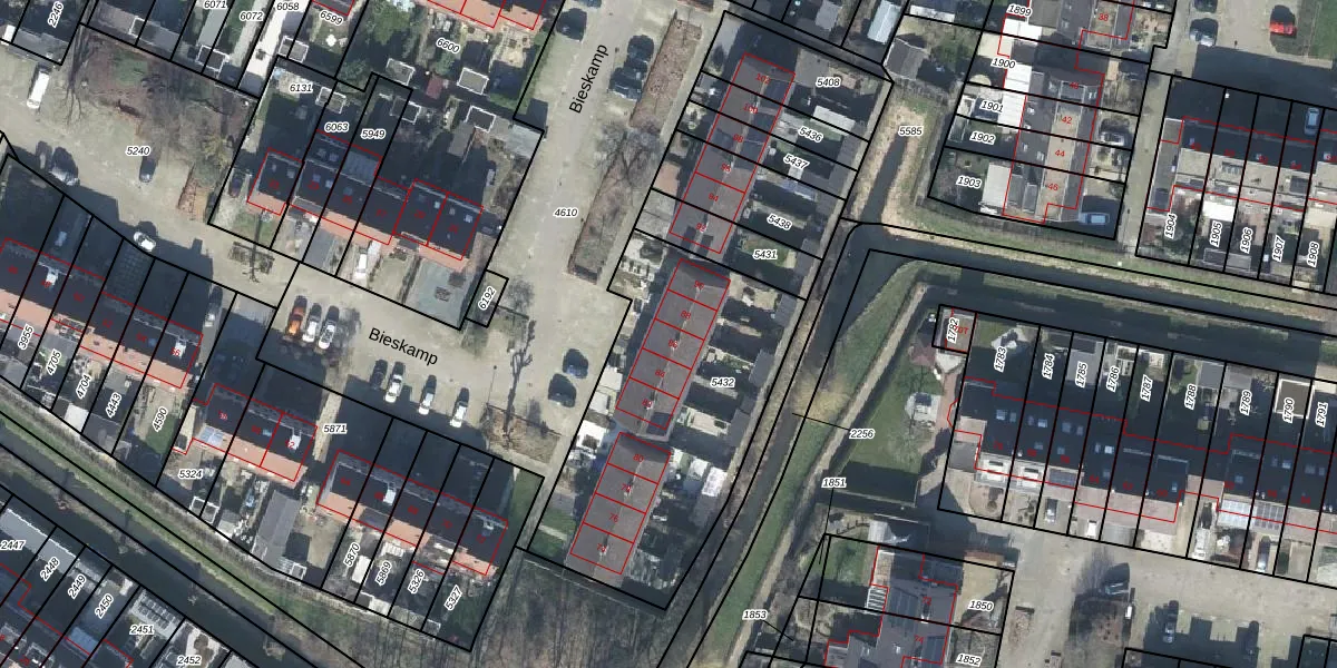 Het perceel waarop Bieskamp 86 staat heeft een oppervlakte van 1264 m². Dit is een zeer groot perceel. De perceeloppervlakte wordt geregistreerd door het Kadaster. Gedetailleerde informatie over de maten van dit perceel kunt u vinden in het rapport Kadastrale kaart met maatvoering van Bieskamp 86.