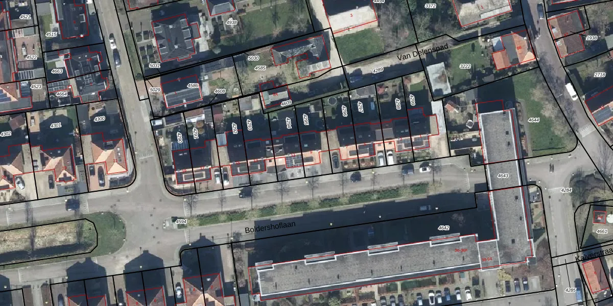 Boldershoflaan 9 is gelegen op kadastraal perceel DTN03B4295. Deze kadastrale aanduiding is uniek en wordt gebruikt door het Kadaster om eigendomsrechten en andere zakelijke rechten vast te leggen. Het perceel maakt onderdeel uit van de kadastrale gemeente Druten.