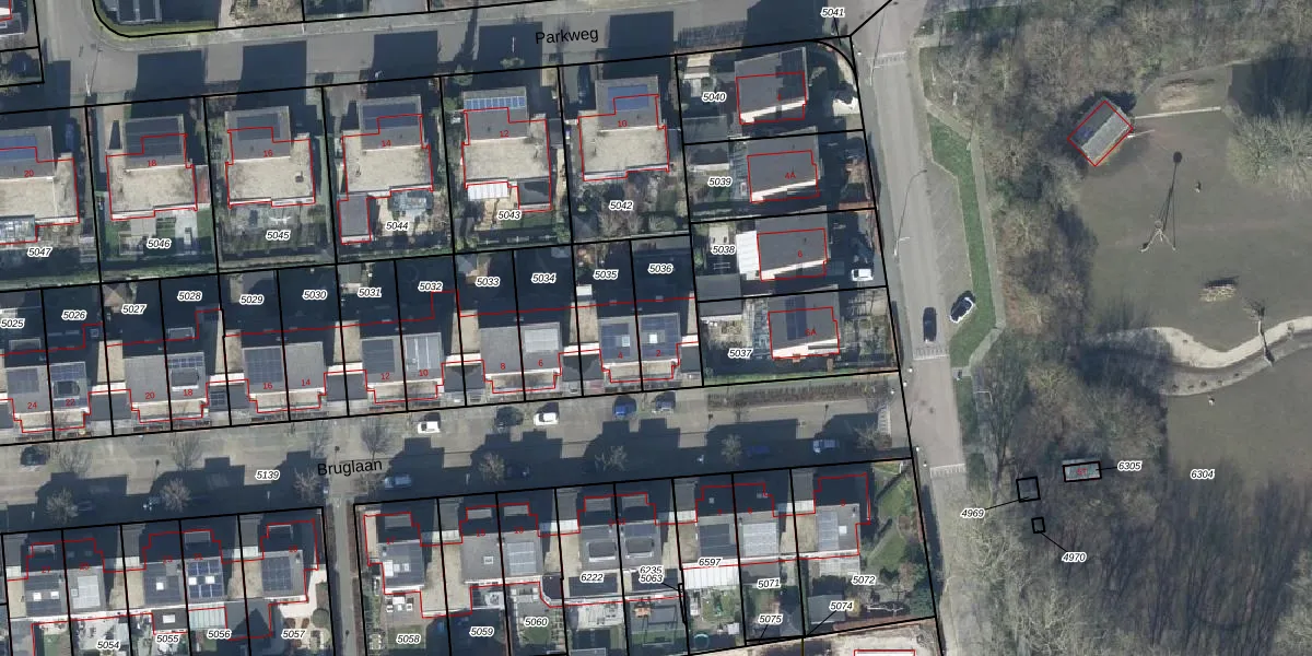 Bruglaan 2 is gelegen op kadastraal perceel DTN03C5036. Deze kadastrale aanduiding is uniek en wordt gebruikt door het Kadaster om eigendomsrechten en andere zakelijke rechten vast te leggen. Het perceel maakt onderdeel uit van de kadastrale gemeente Druten.
