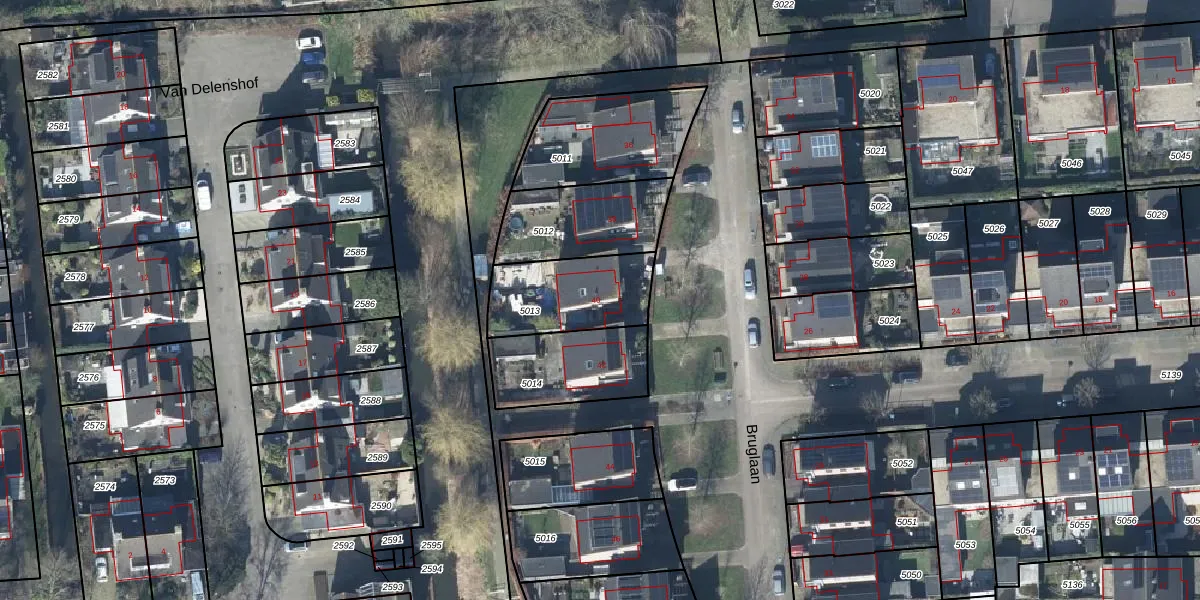 Bruglaan 40 is gelegen op kadastraal perceel DTN03C5013. Deze kadastrale aanduiding is uniek en wordt gebruikt door het Kadaster om eigendomsrechten en andere zakelijke rechten vast te leggen. Het perceel maakt onderdeel uit van de kadastrale gemeente Druten.