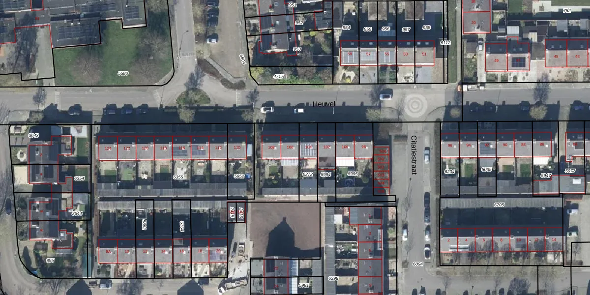 Het perceel waarop Heuvel 106 staat heeft een oppervlakte van 2528 m². Dit is een zeer groot perceel. De perceeloppervlakte wordt geregistreerd door het Kadaster. Gedetailleerde informatie over de maten van dit perceel kunt u vinden in het rapport Kadastrale kaart met maatvoering van Heuvel 106.