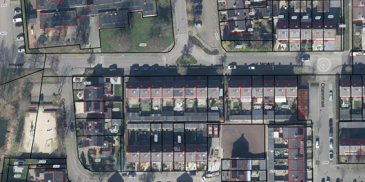 Het perceel waarop Heuvel 116 staat heeft een oppervlakte van 2528 m². Dit is een zeer groot perceel. De perceeloppervlakte wordt geregistreerd door het Kadaster. Gedetailleerde informatie over de maten van dit perceel kunt u vinden in het rapport Kadastrale kaart met maatvoering van Heuvel 116.