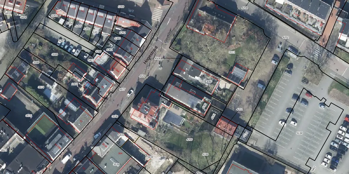 Het perceel waarop Hogestraat 22-A staat heeft een oppervlakte van 425 m². Dit is een groot perceel. De perceeloppervlakte wordt geregistreerd door het Kadaster. Gedetailleerde informatie over de maten van dit perceel kunt u vinden in het rapport Kadastrale kaart met maatvoering van Hogestraat 22-A.