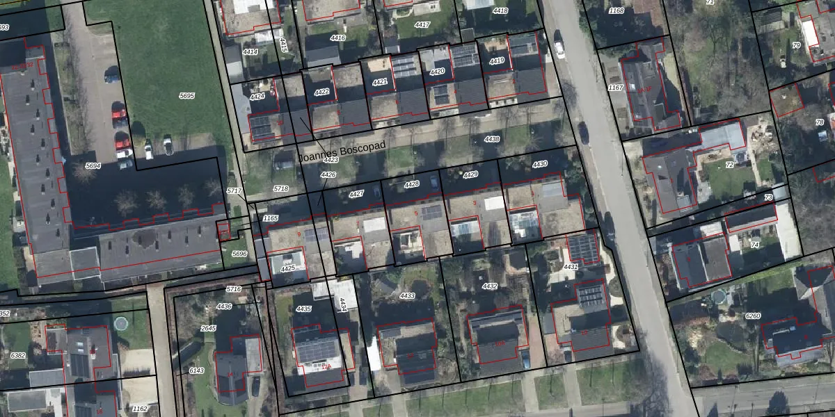Joannes Boscopad 5 is gelegen op kadastraal perceel DTN03C4428. Deze kadastrale aanduiding is uniek en wordt gebruikt door het Kadaster om eigendomsrechten en andere zakelijke rechten vast te leggen. Het perceel maakt onderdeel uit van de kadastrale gemeente Druten.