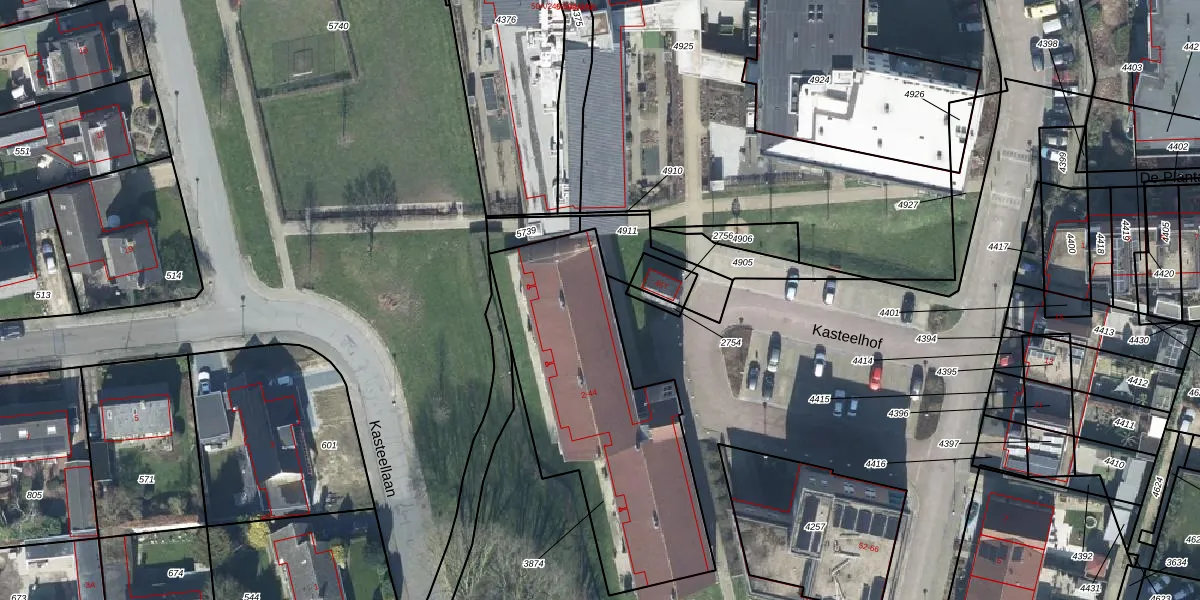 Het perceel waarop Kasteelhof 14 staat heeft een oppervlakte van 1175 m². Dit is een zeer groot perceel. De perceeloppervlakte wordt geregistreerd door het Kadaster. Gedetailleerde informatie over de maten van dit perceel kunt u vinden in het rapport Kadastrale kaart met maatvoering van Kasteelhof 14.
