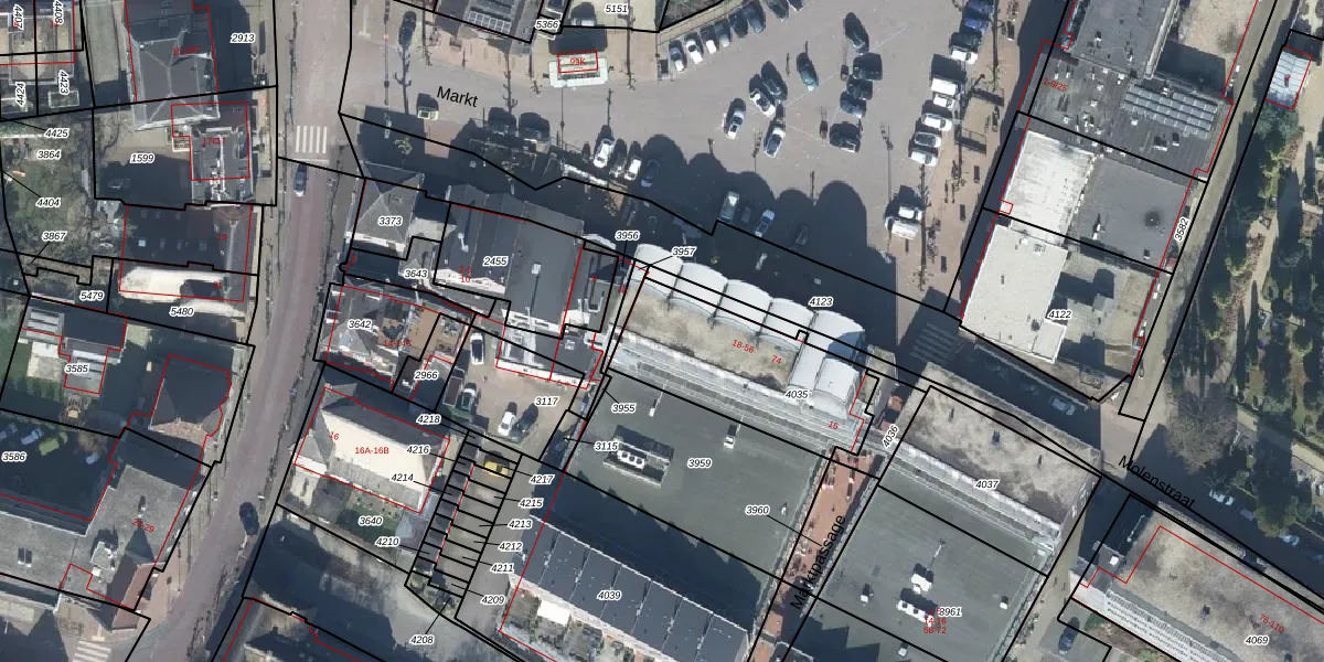 Het perceel waarop Markt 38 staat heeft een oppervlakte van 509 m². Dit is een groot perceel. De perceeloppervlakte wordt geregistreerd door het Kadaster. Gedetailleerde informatie over de maten van dit perceel kunt u vinden in het rapport Kadastrale kaart met maatvoering van Markt 38.