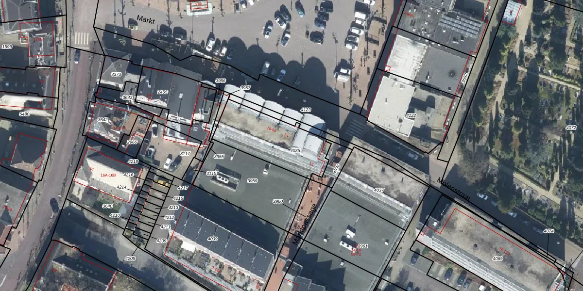 Het perceel waarop Markt 44 staat heeft een oppervlakte van 509 m². Dit is een groot perceel. De perceeloppervlakte wordt geregistreerd door het Kadaster. Gedetailleerde informatie over de maten van dit perceel kunt u vinden in het rapport Kadastrale kaart met maatvoering van Markt 44.