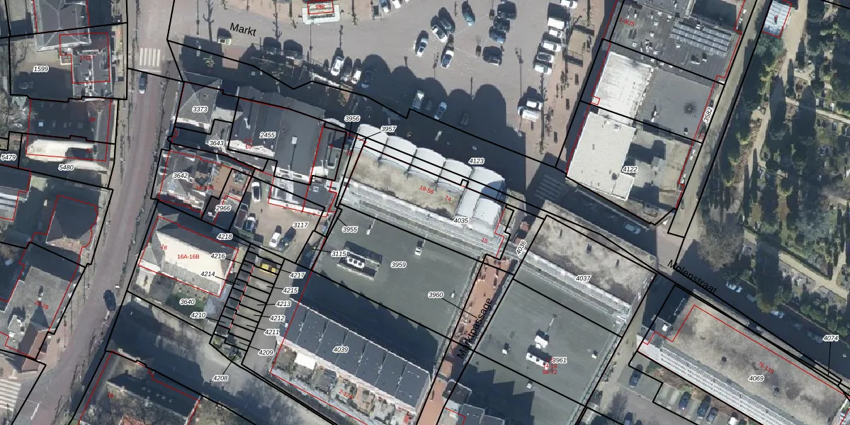 Het perceel waarop Markt 52 staat heeft een oppervlakte van 509 m². Dit is een groot perceel. De perceeloppervlakte wordt geregistreerd door het Kadaster. Gedetailleerde informatie over de maten van dit perceel kunt u vinden in het rapport Kadastrale kaart met maatvoering van Markt 52.