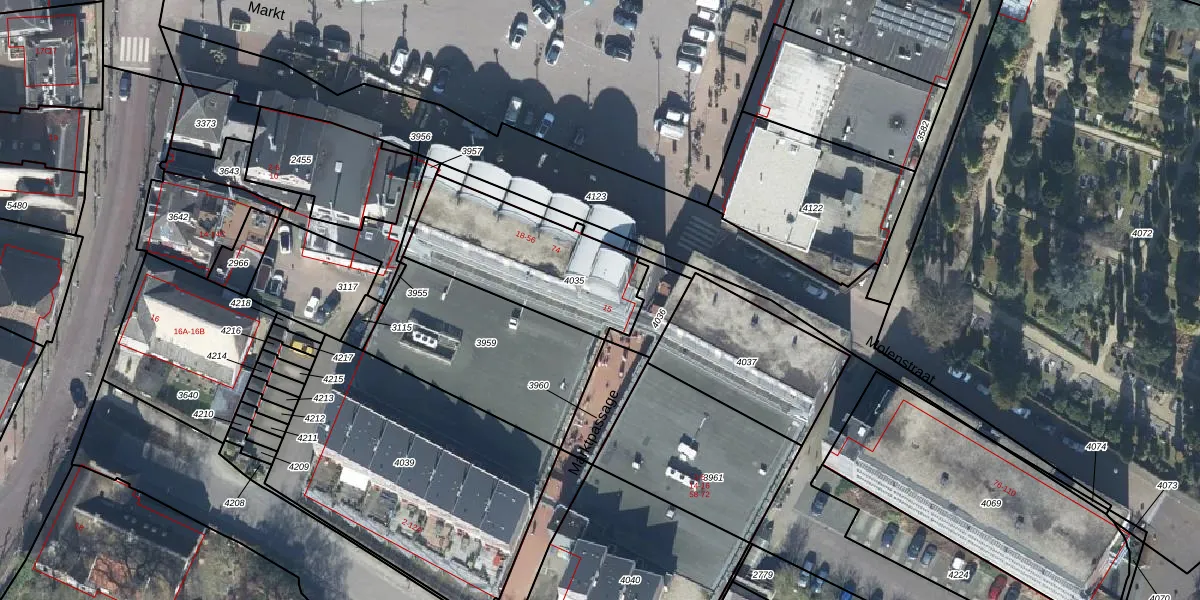 Het perceel waarop Markt 56 staat heeft een oppervlakte van 509 m². Dit is een groot perceel. De perceeloppervlakte wordt geregistreerd door het Kadaster. Gedetailleerde informatie over de maten van dit perceel kunt u vinden in het rapport Kadastrale kaart met maatvoering van Markt 56.