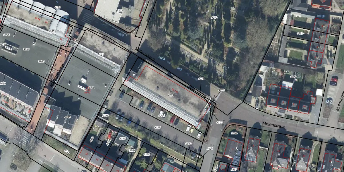 Het perceel waarop Markt 80 staat heeft een oppervlakte van 938 m². Dit is een groot perceel. De perceeloppervlakte wordt geregistreerd door het Kadaster. Gedetailleerde informatie over de maten van dit perceel kunt u vinden in het rapport Kadastrale kaart met maatvoering van Markt 80.