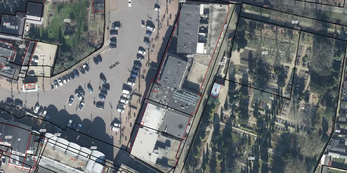 Het perceel waarop Markt 9-17 staat heeft een oppervlakte van 1810 m². Dit is een zeer groot perceel. De perceeloppervlakte wordt geregistreerd door het Kadaster. Gedetailleerde informatie over de maten van dit perceel kunt u vinden in het rapport Kadastrale kaart met maatvoering van Markt 9-17.
