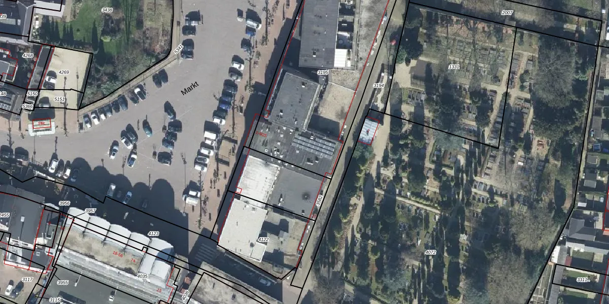 Het perceel waarop Markt 9-30 staat heeft een oppervlakte van 1810 m². Dit is een zeer groot perceel. De perceeloppervlakte wordt geregistreerd door het Kadaster. Gedetailleerde informatie over de maten van dit perceel kunt u vinden in het rapport Kadastrale kaart met maatvoering van Markt 9-30.