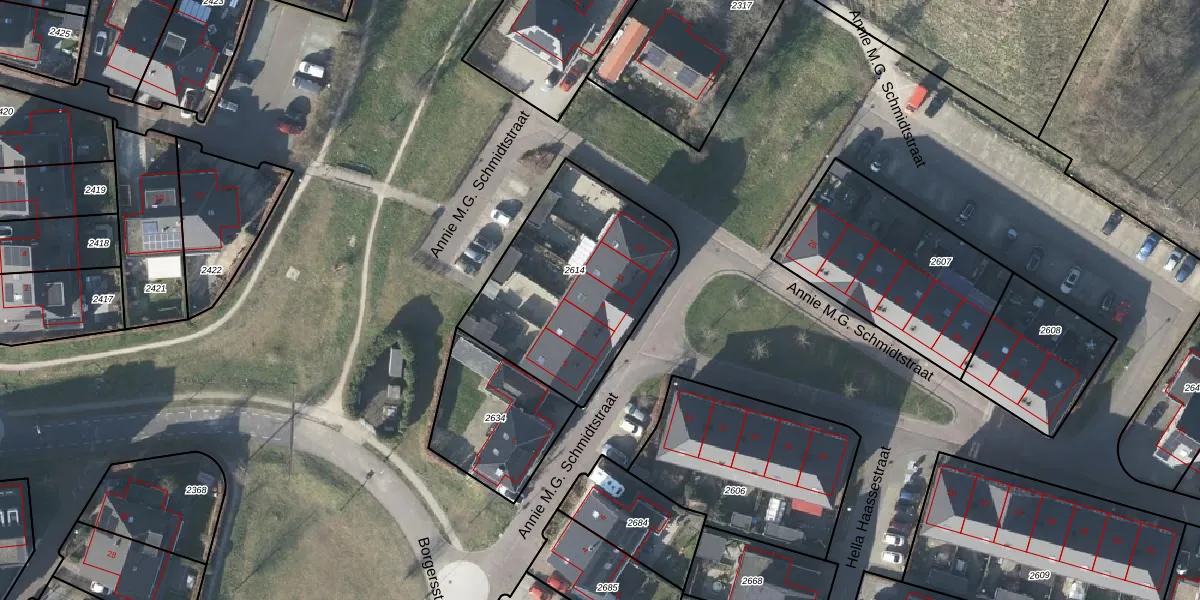 Annie M.G. Schmidtstraat 9 is gelegen op kadastraal perceel DVN00A2614. Deze kadastrale aanduiding is uniek en wordt gebruikt door het Kadaster om eigendomsrechten en andere zakelijke rechten vast te leggen. Het perceel maakt onderdeel uit van de kadastrale gemeente Duiven.