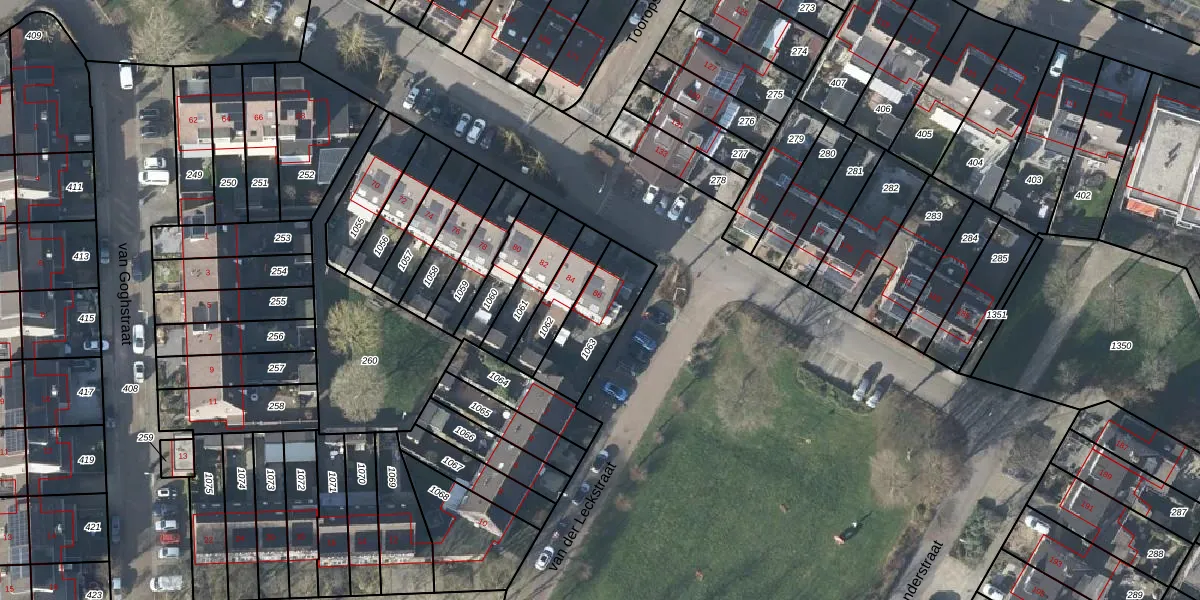 Het perceel waarop het adres ligt is DVN00-G-1063. De afkorting 'DVN00' staat voor kadastrale gemeente Duiven. De gemiddelde perceelgrootte in Duiven is 2659,42 m². Dit perceel is kleiner: de perceeloppervlakte bedraagt 232 m². Het kleinste perceel in de kadastrale gemeente is 0 m² groot. De grootste perceeloppervlakte is 22,4 ha. Op het perceel bevinden zich geen andere adressen. In de Basisregistratie Kadaster (BRK) werden de grenzen van het perceel geregistreerd op 11-02-2009.