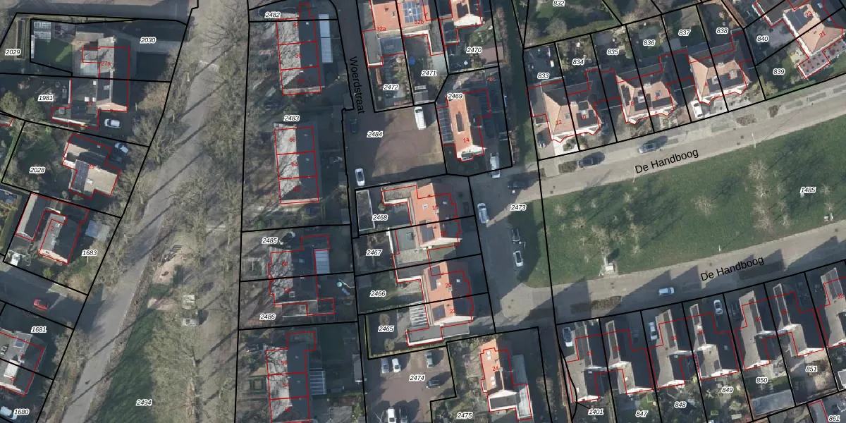De Handboog 16 is gelegen op kadastraal perceel DVN00A2468. Deze kadastrale aanduiding is uniek en wordt gebruikt door het Kadaster om eigendomsrechten en andere zakelijke rechten vast te leggen. Het perceel maakt onderdeel uit van de kadastrale gemeente Duiven.