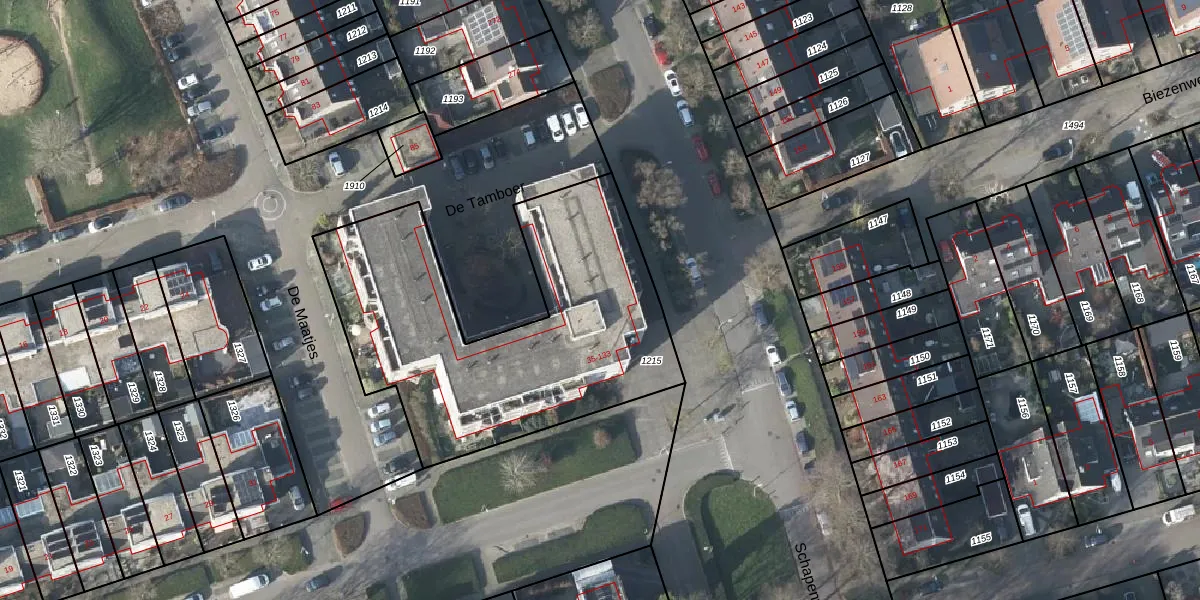 Het perceel waarop De Tamboer 127 staat heeft een oppervlakte van 1632 m². Dit is een zeer groot perceel. De perceeloppervlakte wordt geregistreerd door het Kadaster. Gedetailleerde informatie over de maten van dit perceel kunt u vinden in het rapport Kadastrale kaart met maatvoering van De Tamboer 127.