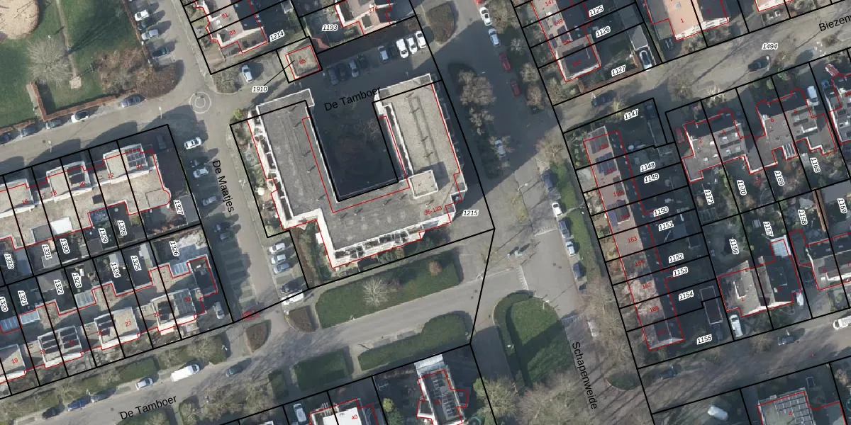 Het perceel waarop De Tamboer 79 staat heeft een oppervlakte van 1632 m². Dit is een zeer groot perceel. De perceeloppervlakte wordt geregistreerd door het Kadaster. Gedetailleerde informatie over de maten van dit perceel kunt u vinden in het rapport Kadastrale kaart met maatvoering van De Tamboer 79.