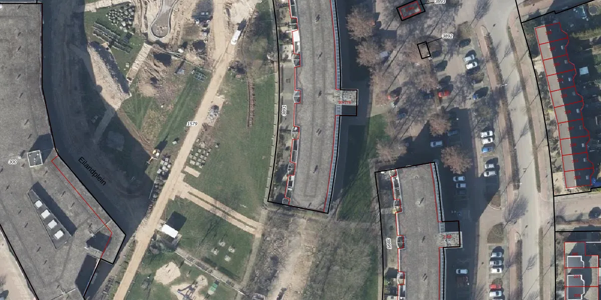 Het perceel waarop Eilandplein 124 staat heeft een oppervlakte van 1570 m². Dit is een zeer groot perceel. De perceeloppervlakte wordt geregistreerd door het Kadaster. Gedetailleerde informatie over de maten van dit perceel kunt u vinden in het rapport Kadastrale kaart met maatvoering van Eilandplein 124.