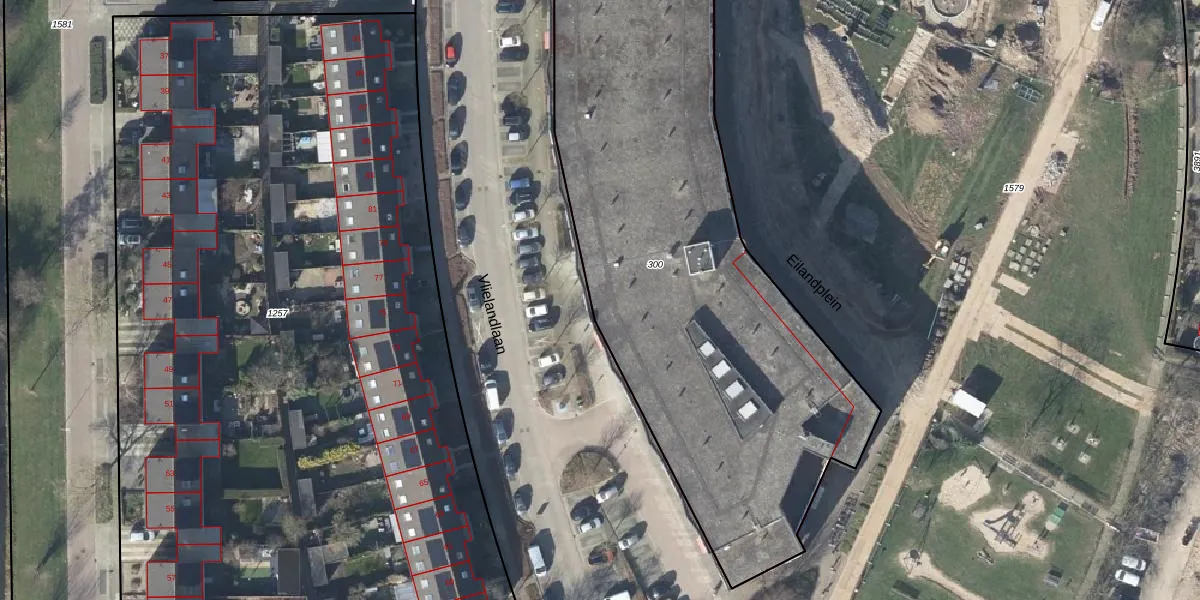 Het perceel waarop Eilandplein 408 staat heeft een oppervlakte van 2950 m². Dit is een zeer groot perceel. De perceeloppervlakte wordt geregistreerd door het Kadaster. Gedetailleerde informatie over de maten van dit perceel kunt u vinden in het rapport Kadastrale kaart met maatvoering van Eilandplein 408.
