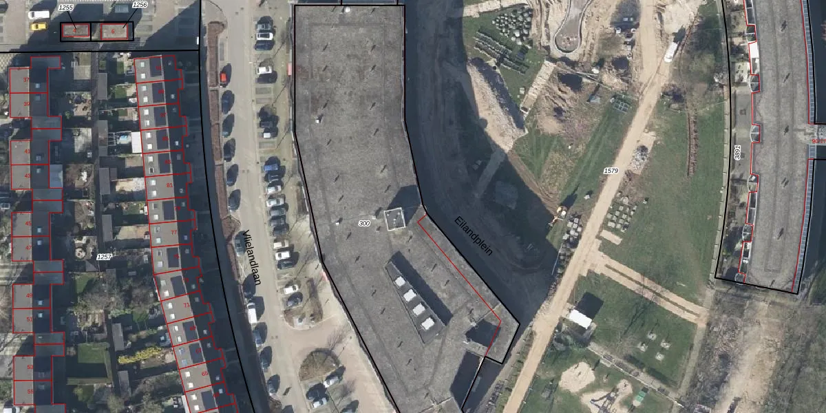 Het perceel waarop Eilandplein 476 staat heeft een oppervlakte van 2950 m². Dit is een zeer groot perceel. De perceeloppervlakte wordt geregistreerd door het Kadaster. Gedetailleerde informatie over de maten van dit perceel kunt u vinden in het rapport Kadastrale kaart met maatvoering van Eilandplein 476.