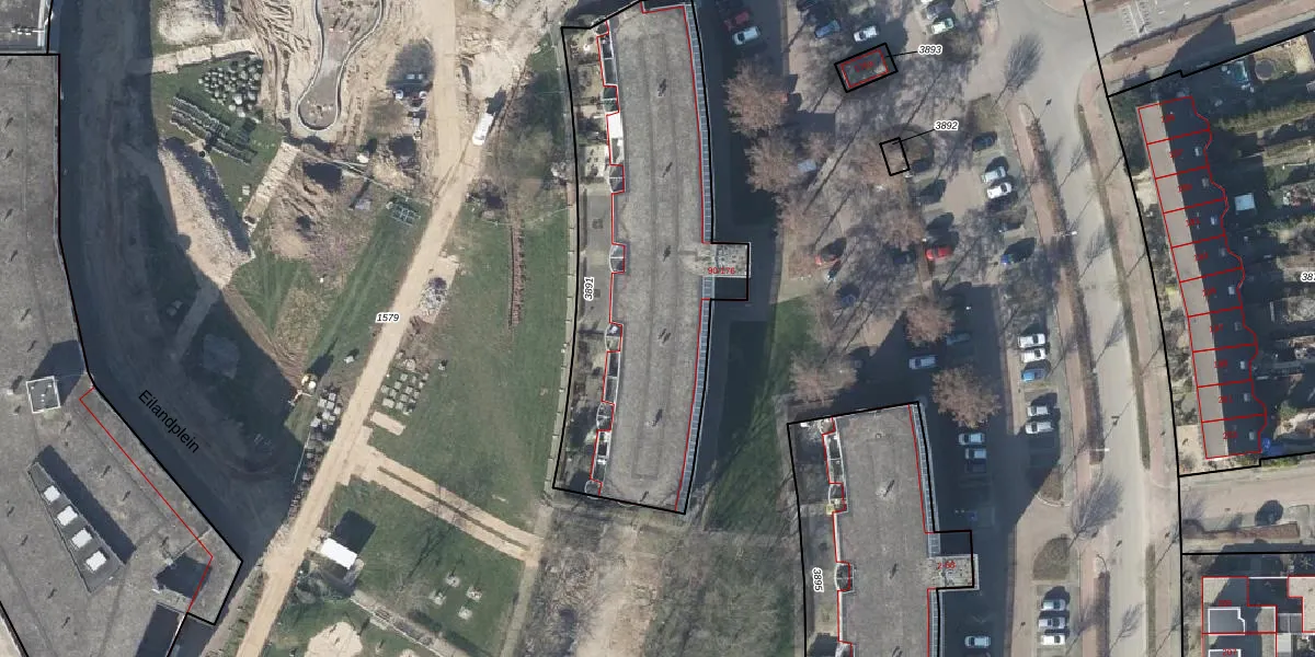 Het perceel waarop Eilandplein 94 staat heeft een oppervlakte van 1570 m². Dit is een zeer groot perceel. De perceeloppervlakte wordt geregistreerd door het Kadaster. Gedetailleerde informatie over de maten van dit perceel kunt u vinden in het rapport Kadastrale kaart met maatvoering van Eilandplein 94.