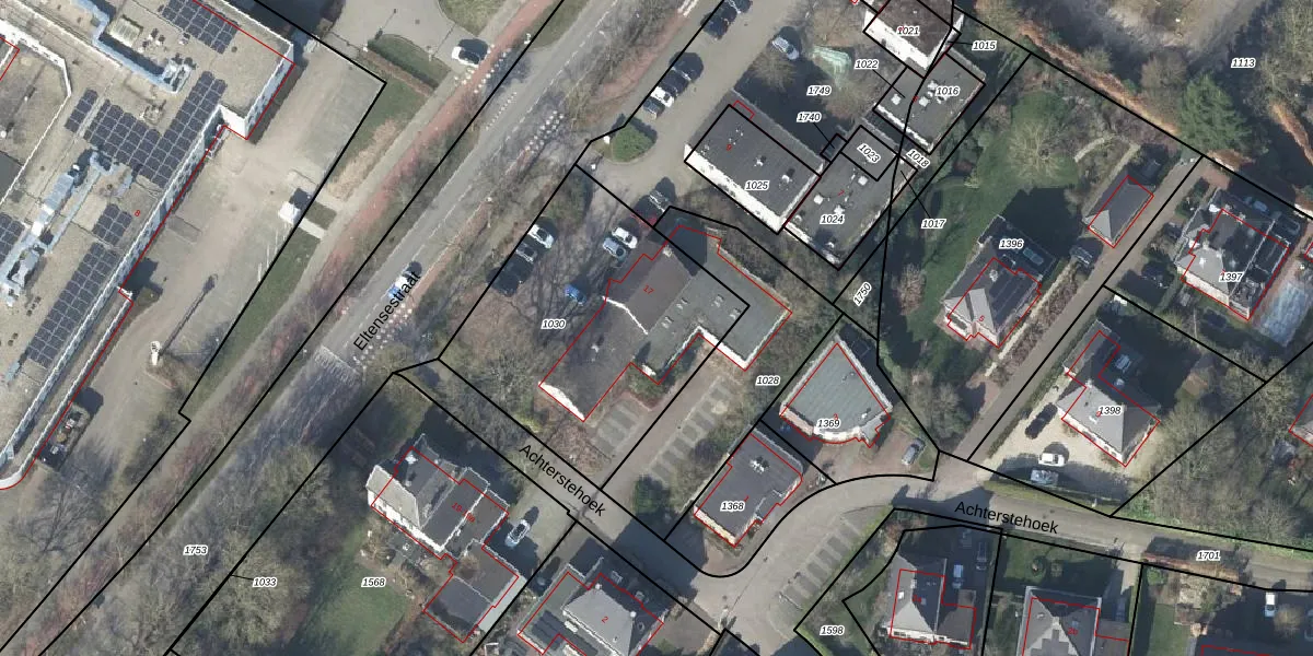 Het perceel waarop Eltensestraat 17-n staat heeft een oppervlakte van 1220 m². Dit is een zeer groot perceel. De perceeloppervlakte wordt geregistreerd door het Kadaster. Gedetailleerde informatie over de maten van dit perceel kunt u vinden in het rapport Kadastrale kaart met maatvoering van Eltensestraat 17-n.