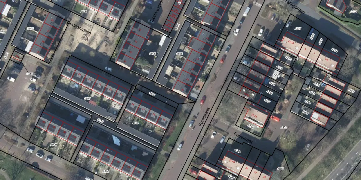 Fuutstraat 20 is gelegen op kadastraal perceel DVN00E1505. Deze kadastrale aanduiding is uniek en wordt gebruikt door het Kadaster om eigendomsrechten en andere zakelijke rechten vast te leggen. Het perceel maakt onderdeel uit van de kadastrale gemeente Duiven.