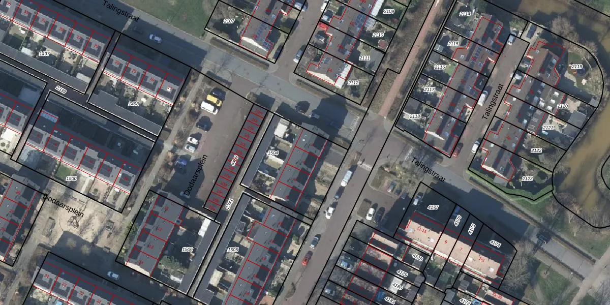 Het adres is gelegen op perceel 1504 in de sectie E en de kadastrale gemeente Duiven. De kadastrale aanduiding is aldus DVN00-E-1504. De gemiddelde perceelgrootte in Duiven is 2661,35 m². Dit perceel is kleiner: de perceeloppervlakte bedraagt 693 m². Het kleinste perceel in de kadastrale gemeente is 0 m² groot. De grootste perceeloppervlakte is 22,4 ha. Op het perceel zijn 4 adressen aanwezig. In de Basisregistratie Kadaster (BRK) werden de grenzen van het perceel geregistreerd op 22-01-1998.