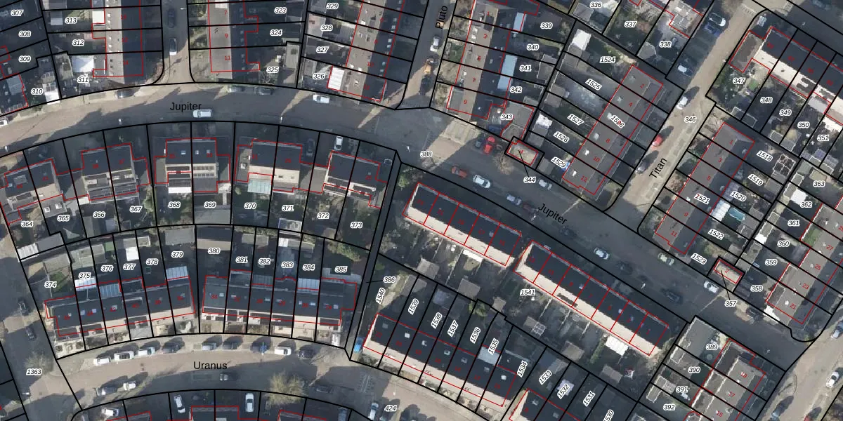 Het perceel waarop Jupiter 23 staat heeft een oppervlakte van 1679 m². Dit is een zeer groot perceel. De perceeloppervlakte wordt geregistreerd door het Kadaster. Gedetailleerde informatie over de maten van dit perceel kunt u vinden in het rapport Kadastrale kaart met maatvoering van Jupiter 23.