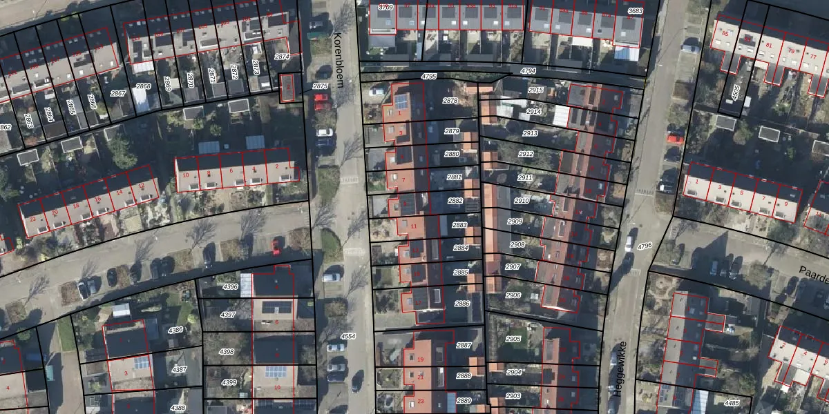 Korenbloem 9 is gelegen op kadastraal perceel DVN00E2882. Deze kadastrale aanduiding is uniek en wordt gebruikt door het Kadaster om eigendomsrechten en andere zakelijke rechten vast te leggen. Het perceel maakt onderdeel uit van de kadastrale gemeente Duiven.