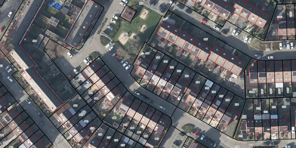 Het perceel waarop Marisstraat 10 staat heeft een oppervlakte van 144 m². Dit is een middelgroot perceel. De perceeloppervlakte wordt geregistreerd door het Kadaster. Gedetailleerde informatie over de maten van dit perceel kunt u vinden in het rapport Kadastrale kaart met maatvoering van Marisstraat 10.