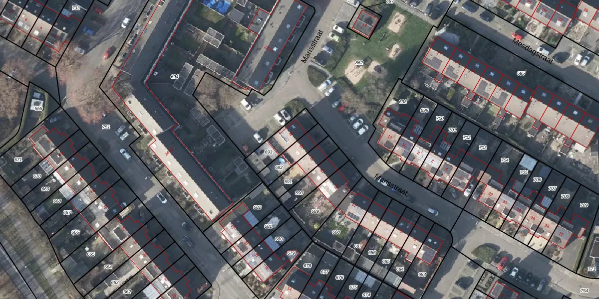 Het perceel waarop Marisstraat 19 staat heeft een oppervlakte van 144 m². Dit is een middelgroot perceel. De perceeloppervlakte wordt geregistreerd door het Kadaster. Gedetailleerde informatie over de maten van dit perceel kunt u vinden in het rapport Kadastrale kaart met maatvoering van Marisstraat 19.