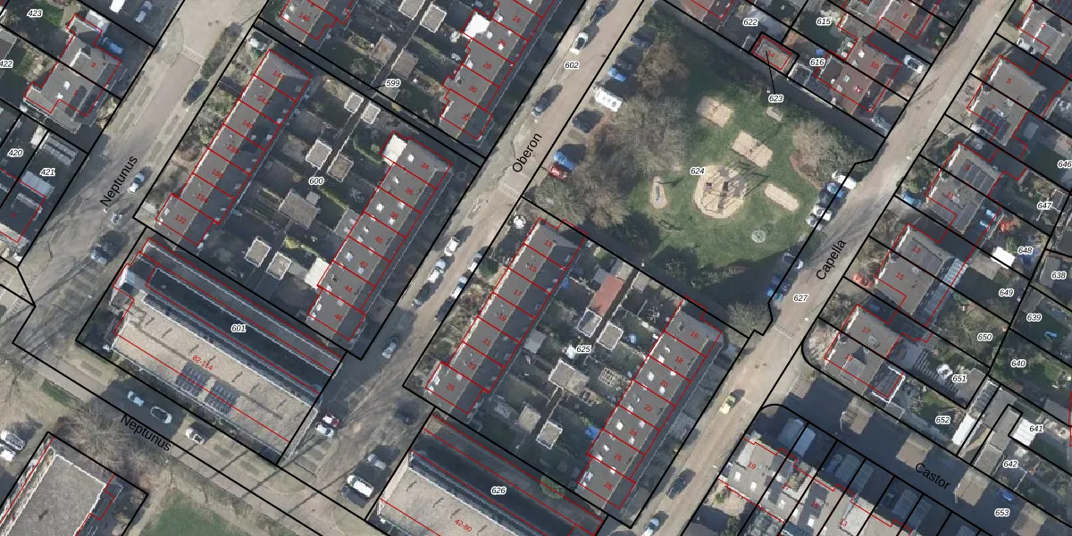 Het perceel waarop Oberon 15 staat heeft een oppervlakte van 2095 m². Dit is een zeer groot perceel. De perceeloppervlakte wordt geregistreerd door het Kadaster. Gedetailleerde informatie over de maten van dit perceel kunt u vinden in het rapport Kadastrale kaart met maatvoering van Oberon 15.
