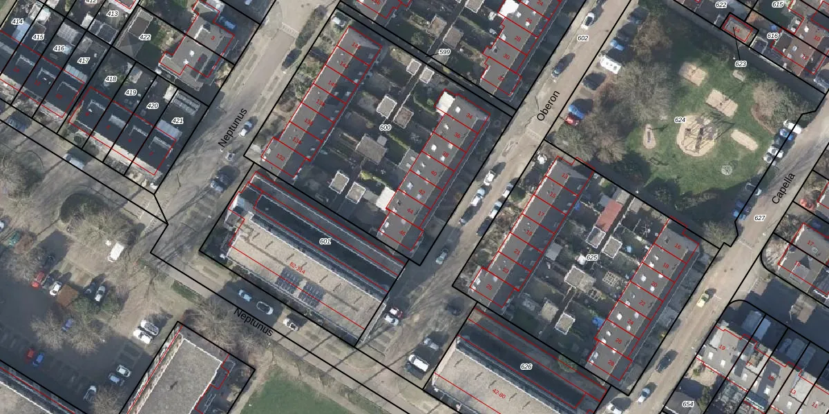 Het perceel waarop Oberon 44 staat heeft een oppervlakte van 2115 m². Dit is een zeer groot perceel. De perceeloppervlakte wordt geregistreerd door het Kadaster. Gedetailleerde informatie over de maten van dit perceel kunt u vinden in het rapport Kadastrale kaart met maatvoering van Oberon 44.