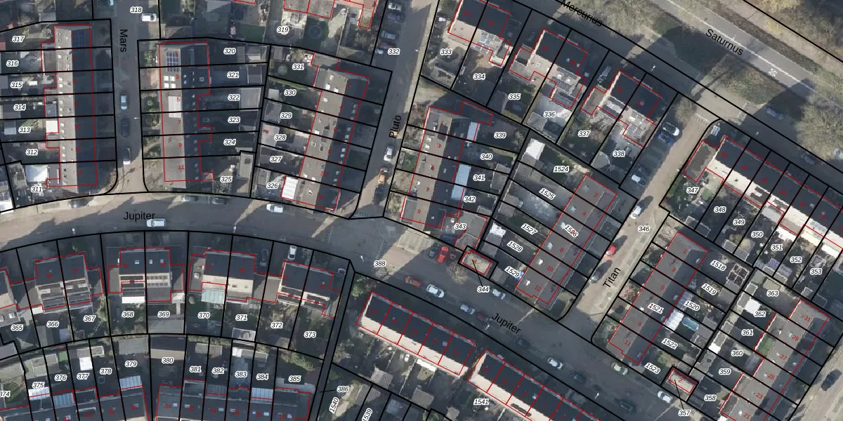 Het perceel waarop Pluto 9 staat heeft een oppervlakte van 192 m². Dit is een middelgroot perceel. De perceeloppervlakte wordt geregistreerd door het Kadaster. Gedetailleerde informatie over de maten van dit perceel kunt u vinden in het rapport Kadastrale kaart met maatvoering van Pluto 9.