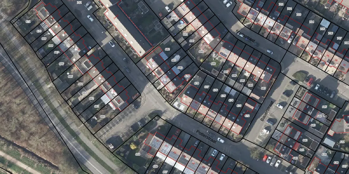 Het perceel waarop Potterstraat 16 staat heeft een oppervlakte van 204 m². Dit is een middelgroot perceel. De perceeloppervlakte wordt geregistreerd door het Kadaster. Gedetailleerde informatie over de maten van dit perceel kunt u vinden in het rapport Kadastrale kaart met maatvoering van Potterstraat 16.