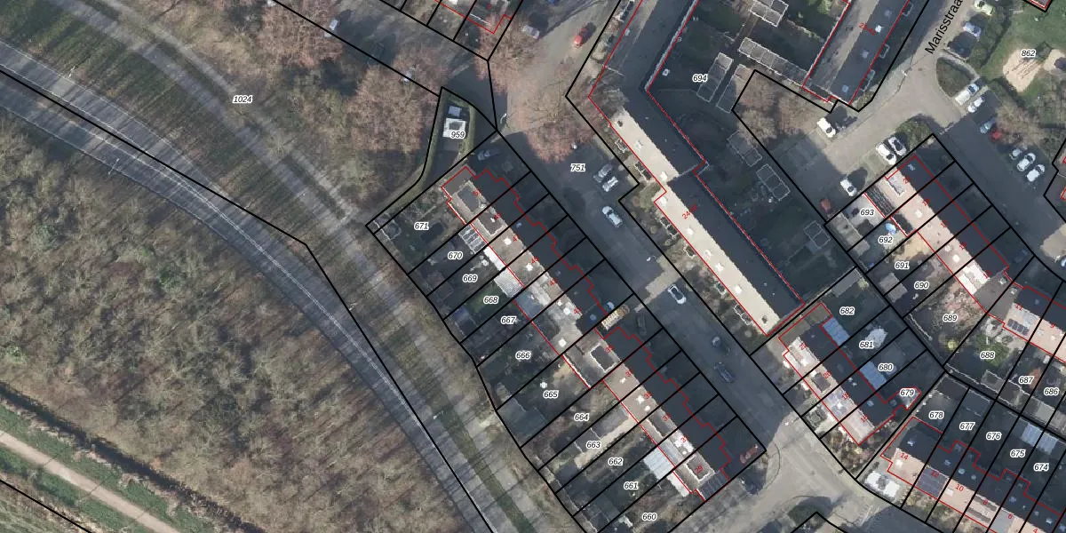Het adres is gelegen op perceel 668 in de sectie G en de kadastrale gemeente Duiven. De kadastrale aanduiding is aldus DVN00-G-668. De gemiddelde perceelgrootte in Duiven is 2659,42 m². Dit perceel is kleiner: de perceeloppervlakte bedraagt 168 m². De grootste perceeloppervlakte in de kadastrale gemeente is 22,4 ha. De kleinste oppervlakte bedraagt 0 m². Dit is het enige adres dat aanwezig is op het perceel. De huidige grenzen van het perceel zijn digitaal in de Basisregistratie Kadaster (BRK) geregistreerd op 06-11-2003.