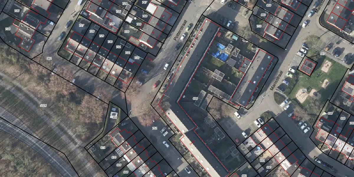 Het perceel waarop Potterstraat 54 staat heeft een oppervlakte van 3516 m². Dit is een zeer groot perceel. De perceeloppervlakte wordt geregistreerd door het Kadaster. Gedetailleerde informatie over de maten van dit perceel kunt u vinden in het rapport Kadastrale kaart met maatvoering van Potterstraat 54.